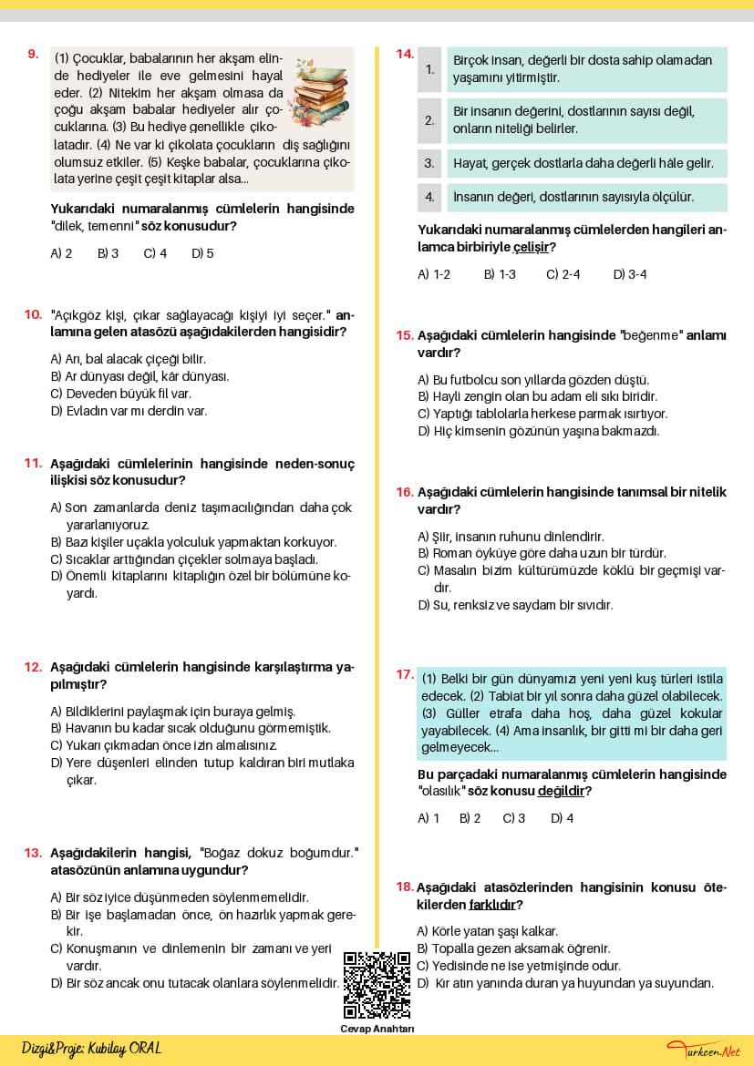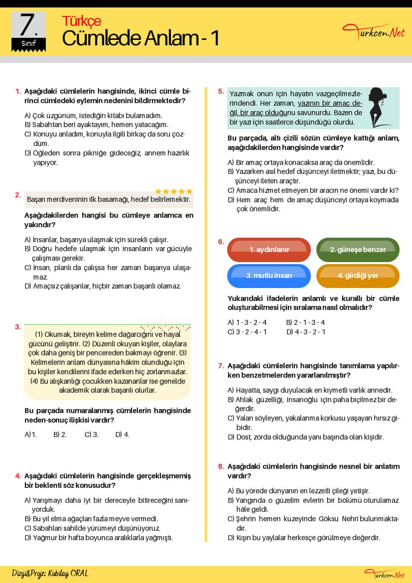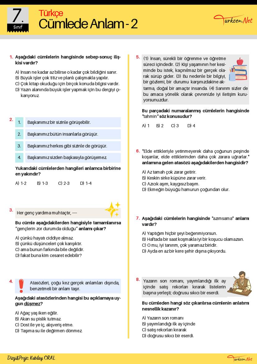 7. sınıf Türkçe müfredatının merkezinde yer alan ve öğrencilerin üst düzey düşünme becerilerini geliştirmeyi hedefleyen bu kapsamlı 7. Sınıf Cümlede Anlam Testi, Türkiye Yüzyılı Maarif Modeli’nin yetkinlik temelli ve bütüncül eğitim vizyonuyla tam uyumlu olarak hazırlanmıştır. İçeriğinde sebep-sonuç (neden-sonuç), karşılaştırma, tahmin ve olasılık cümlelerinin yanı sıra atasözleri, tanım cümleleri ve anlamca en yakın cümle tespiti gibi kritik kazanımları ölçen nitelikli sorular barındıran bu doküman, hem okul yazılılarına hazırlık hem de LGS maratonu için mükemmel bir yardımcı kaynaktır. Cümleler arası anlam ilişkilerini analiz etme ve dilin mantıksal kurgusunu kavrama imkanı sunan bu nitelikli Türkçe test çöz materyali, öğrencilerin okuma-anlama yetilerini en üst seviyeye taşımak amacıyla tasarlanmıştır.
