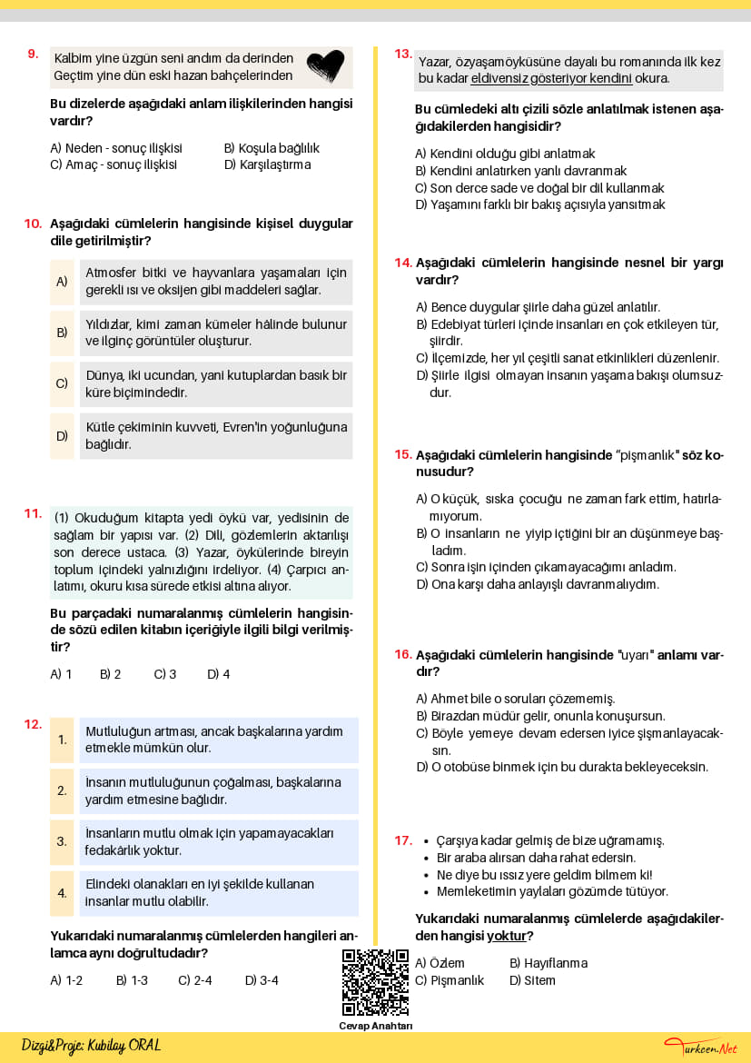 7. sınıf Türkçe öğretim programının anlam bilgisi alanındaki ileri düzey kazanımlarını ölçmek amacıyla hazırlanan 7. Sınıf Cümlede Anlam-3 Testi, öğrencilerin dil becerilerini Türkiye Yüzyılı Maarif Modeli’nin öngördüğü beceri odaklı ve bütüncül yaklaşım çerçevesinde geliştirmeyi hedeflemektedir. Cümleler arası anlam ilişkilerini, cümledeki anlamları kapsayan bu profesyonel içerik, hem okul yazılılarına hazırlık hem de LGS maratonu için nitelikli bir kaynak teşkil etmektedir.