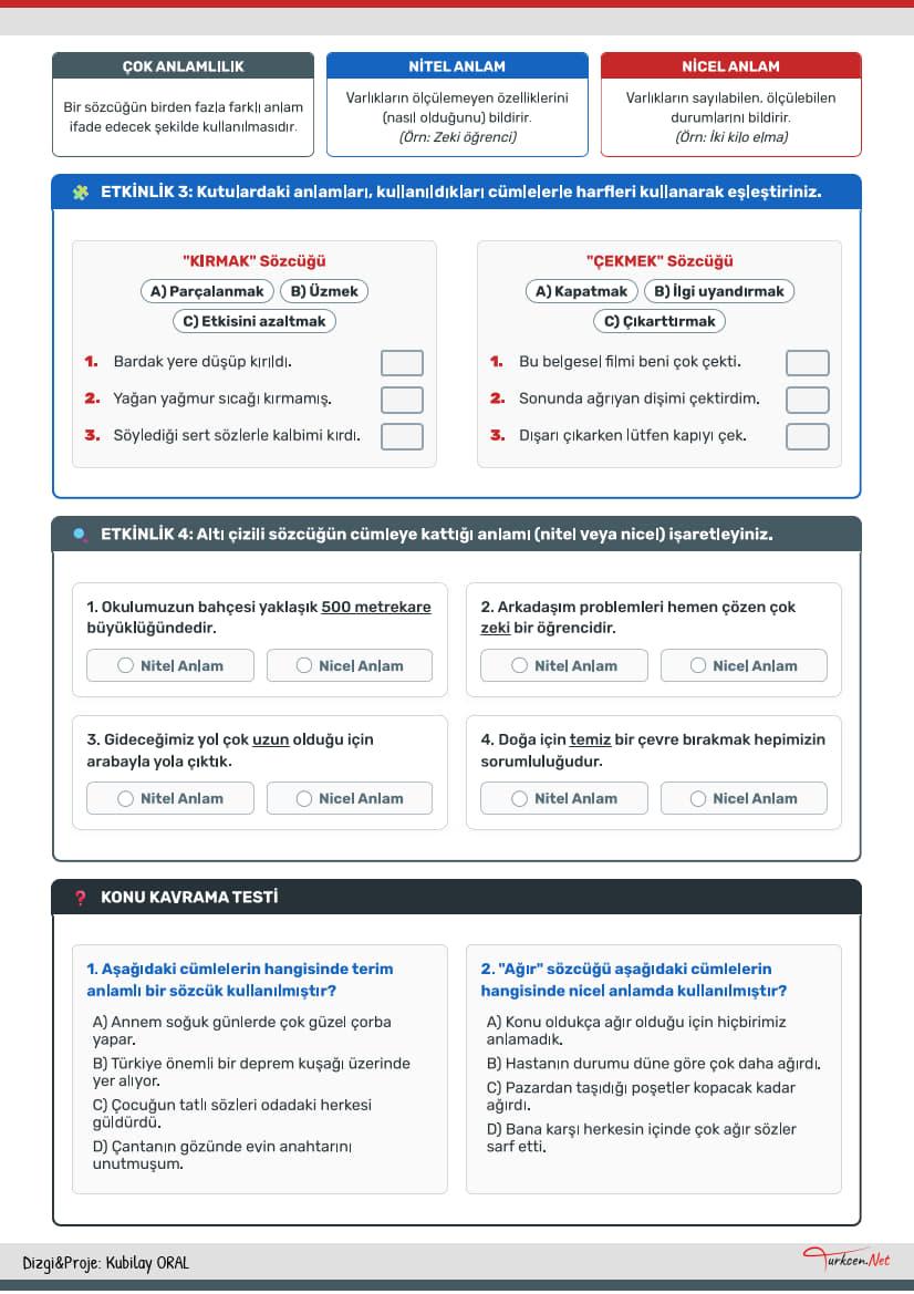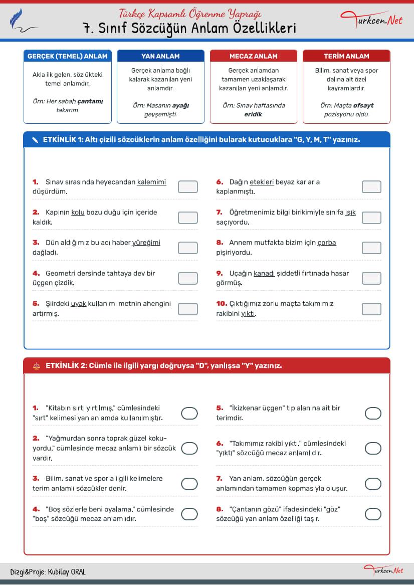 7. sınıf Türkçe müfredatına tam uyumlu olarak hazırlanan 7. Sınıf Sözcüğün Anlam Özellikleri Çalışma Kâğıdı bu kapsamlı öğrenme yaprağı, öğrencilerin sözcüğün anlam özellikleri konusunu derinlemesine kavramasını sağlamaktadır. İçeriğinde gerçek, yan, mecaz ve terim anlam tanımları ile örneklerinin yanı sıra , çok anlamlılık, nitel ve nicel anlam gibi temel dil bilgisi konuları detaylandırılmıştır. Öğrencilerin bilgilerini pekiştirmesi için doğru-yanlış, eşleştirme ve anlam belirleme gibi çeşitli uygulama etkinlikleriyle desteklenen bu doküman , sonunda yer alan konu kavrama testi ile kazanımların ölçülmesine imkan tanır. Kubilay Oral tarafından hazırlanan ve Turkcen.net platformunda paylaşılan bu çalışma kağıdı, hem okul yazılılarına hazırlık sürecinde hem de LGS yolculuğunda öğrencilerin kelime hazinesini güçlendirecek nitelikli bir eğitim materyalidir.