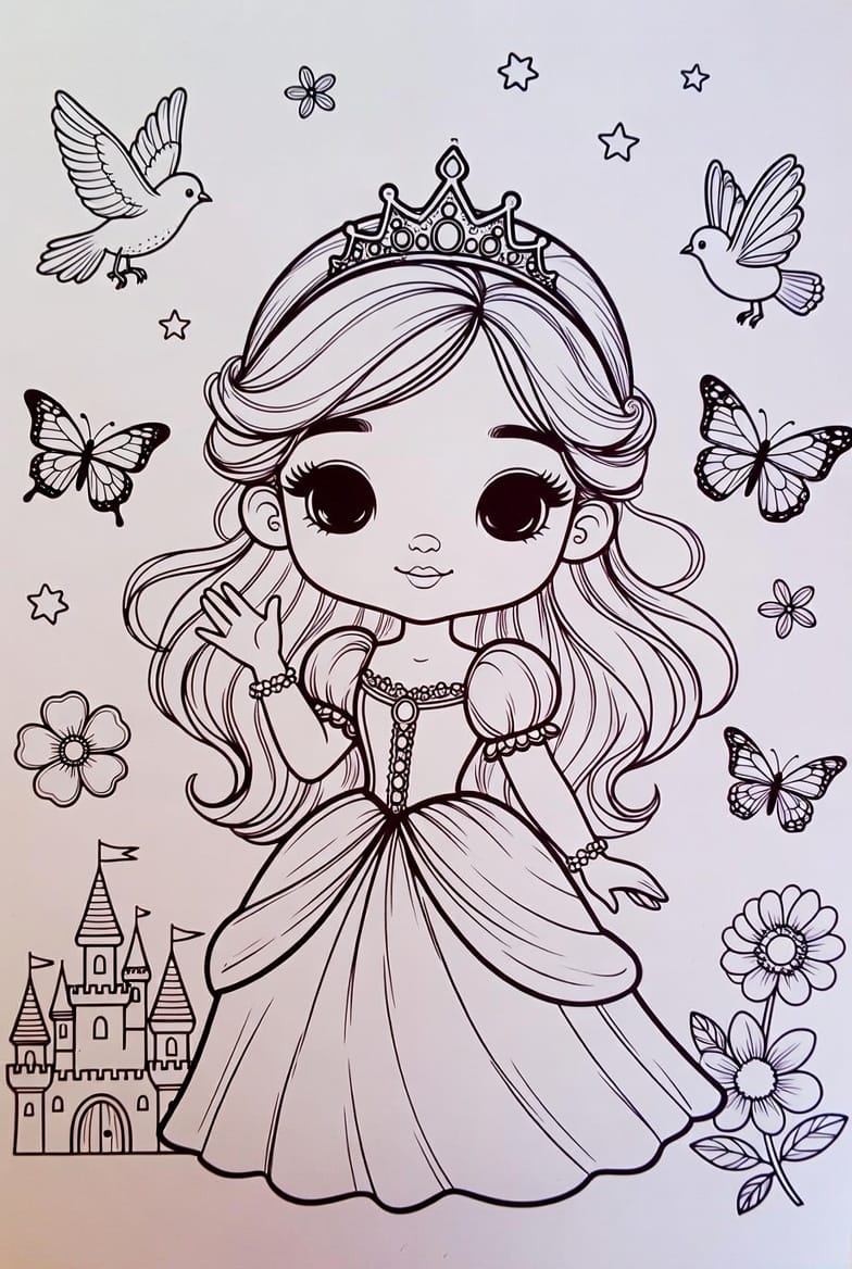 Parıldayan tacı ve muhteşem elbisesiyle dikkat çeken bu şık prenses boyama kağıdını en sevdiğiniz pastel tonlarla hemen süsleyebilirsiniz.
