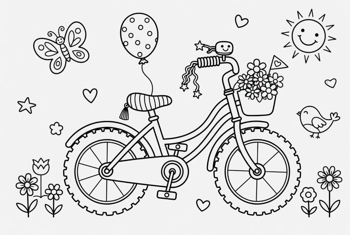 Önünde çiçeklerle dolu bir sepeti olan bu şirin bisikleti boyamak çok keyifli olacak