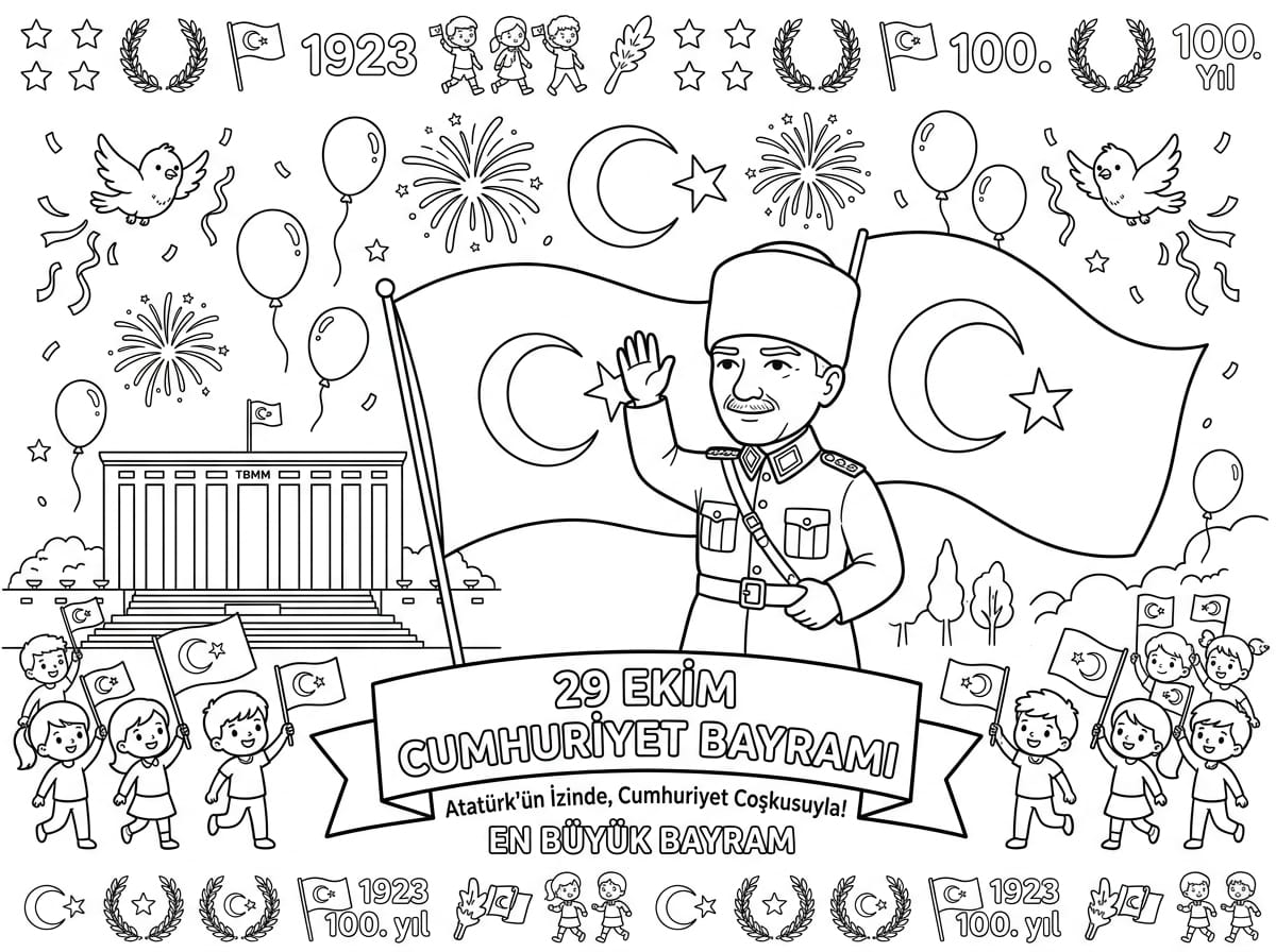 Cumhuriyet meşalesini elinde taşıyan gençlerle geleceğe umutla bakmaya ve bu heyecanı paylaşmaya hazır olun. Farklı renk kombinasyonları deneyerek bu ışığı en parlak şekilde kağıda dökmek tamamen sizin elinizde. Tamamen ücretsiz olan bu şablonu PDF formatında indirip sınıf içi etkinliklerde kullanabilirsiniz