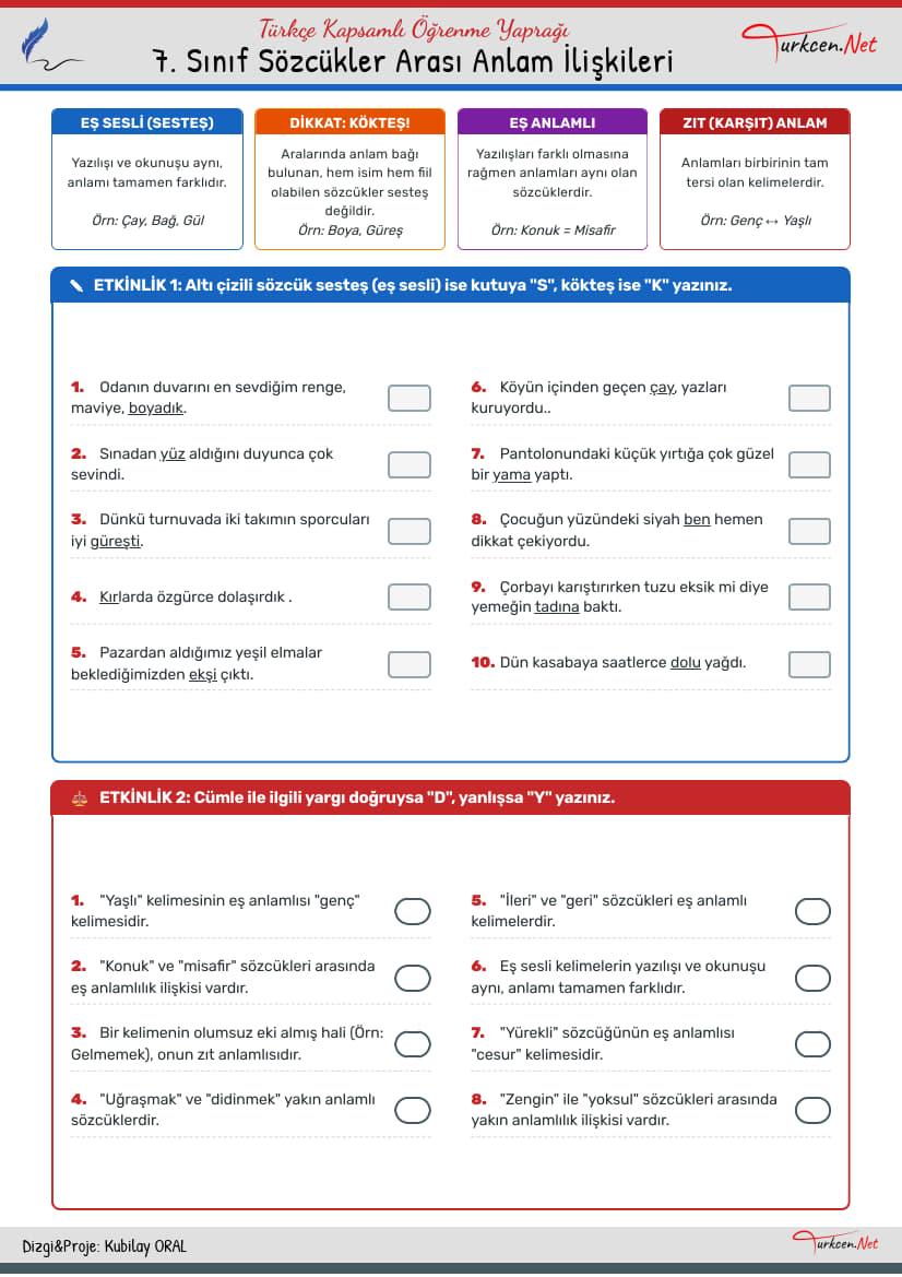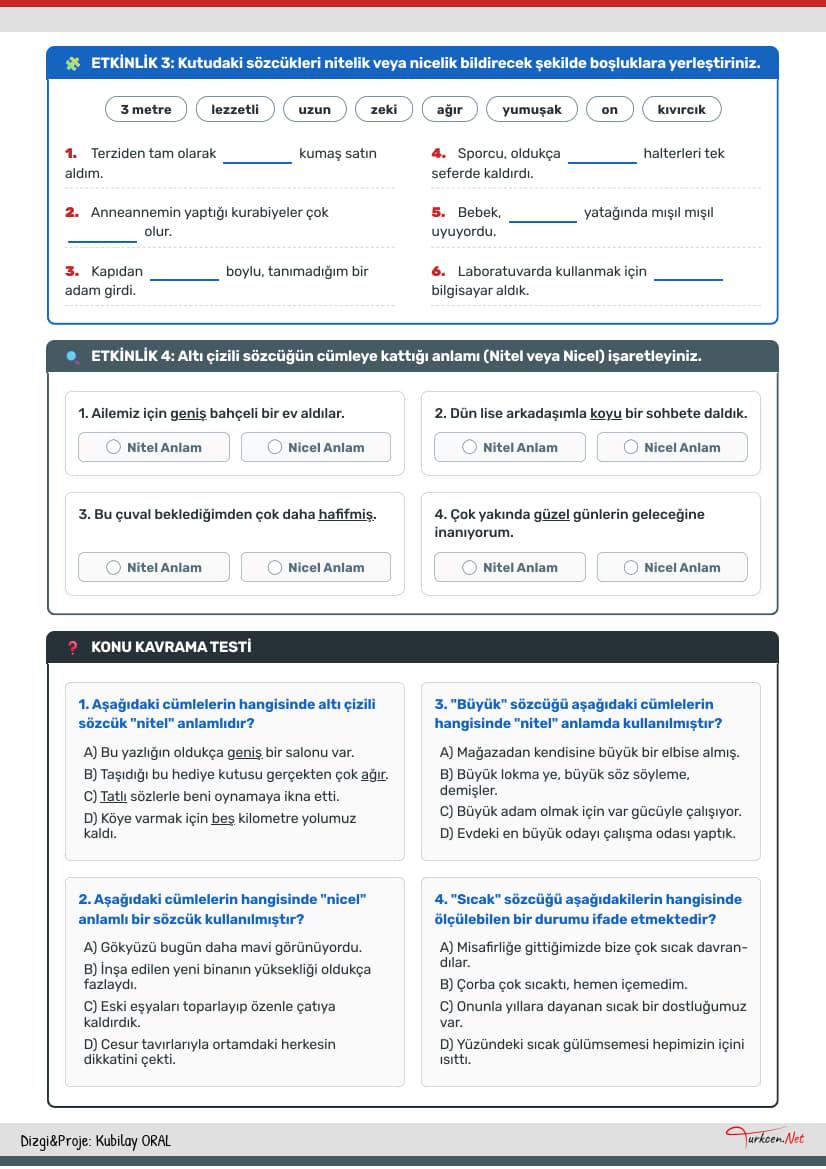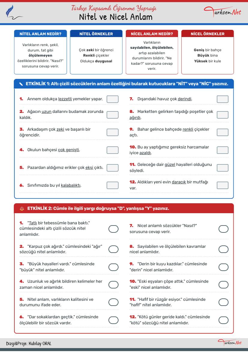 Türkçe dersi söz varlığı ünitesinin en kritik başlıklarından biri olan nitel ve nicel anlam konusunu tam olarak pekiştirmek isteyen öğrenciler ve öğretmenler için hazırladığımız kapsamlı çalışma kağıdı yayında! Müfredatla tam uyumlu, zengin etkinlikler ve konu kavrama testleri içeren bu nitel ve nicel anlam çalışma kağıdı PDF dokümanı, ölçülebilen ve ölçülemeyen özellikleri ayırt etmeyi örneklerle kolaylaştırıyor. Turkcen.net kalitesiyle, dizgisi özenle hazırlanan bu ücretsiz eğitim materyalini hemen indirerek derslerinizi daha verimli hale getirebilir, sınıfta veya bireysel çalışmalarda güvenle kullanabilirsiniz.